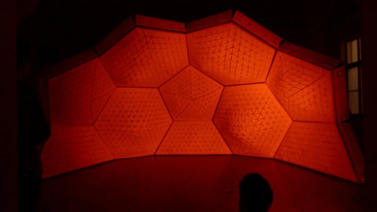 Cerebral Hut is a large scale installation that explores the relationship between architecture, interactivity,movement and human thought. It debuted at the Istanbul Design Biennial 2012 and was later exhibited at the Saatchi Gallery, London in Summer 2013 and SXSW Interactive Festival in Spring 2014 for Pepsi and Fast Company. We traditionally assume that the built environment, whether in the architectural or the urban scale influences our psyche. What if we can reverse that relationship? What if a kinetic architecture could establish a direct connection between the thoughts of its user and itself in order to reconfigure its physical boundaries accordingly? In order to achieve this, an electromechanical computer controlled system was devised that is activated by a wireless input from an EEG helmet that the user wears. The EEG helmet reads the concentration levels of the user and translates them into motion through a code. The more the user concentrates, the more he/ she can transform the physical boundaries of the space.